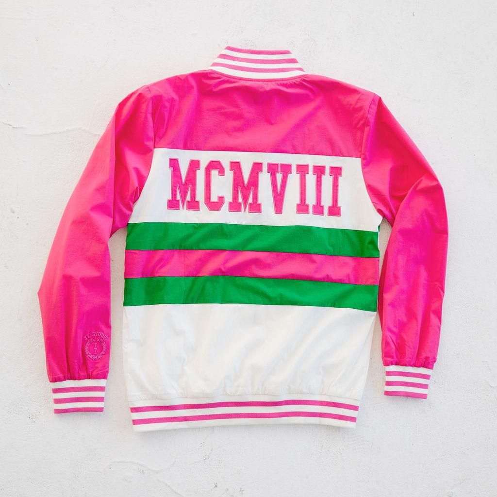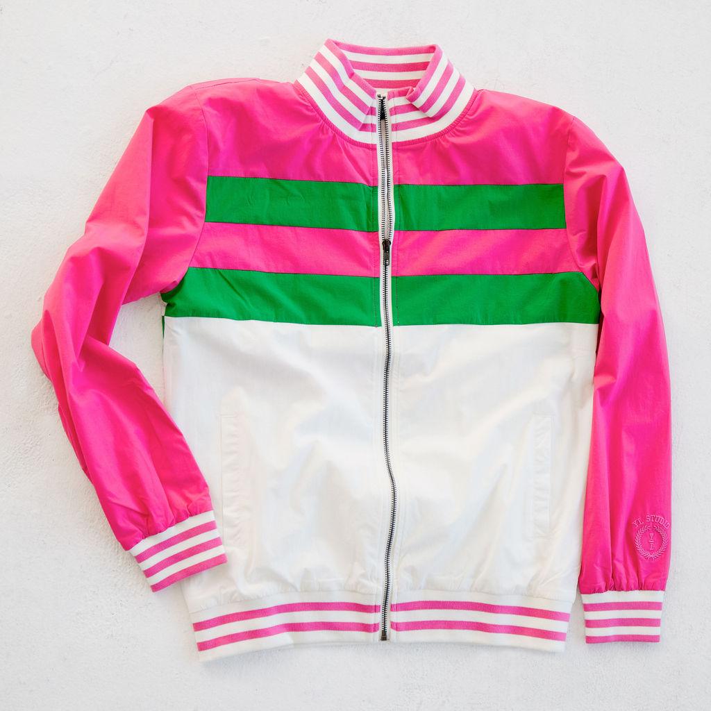 This essential jacket is the perfect piece to add a pop of color to your outfit while on the go. It's a breathable lightweight design with mesh lining and detailed lettering on the back.