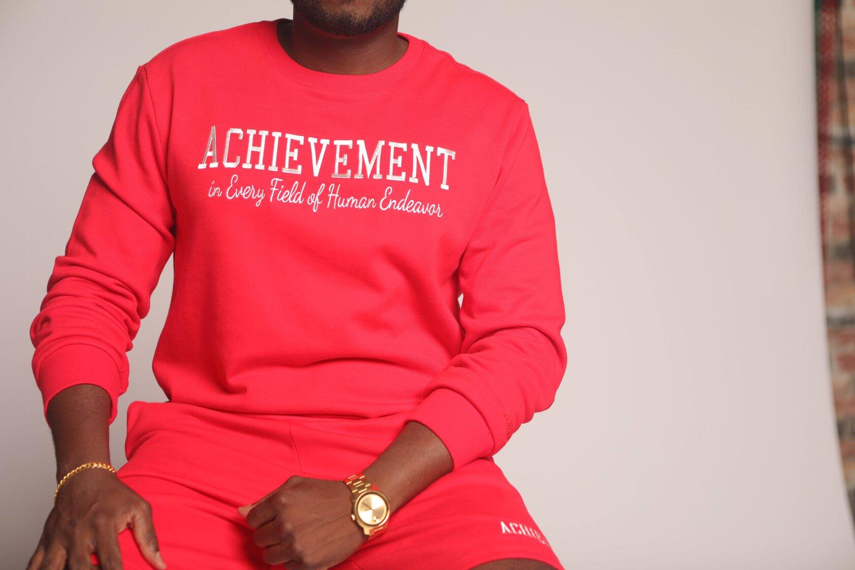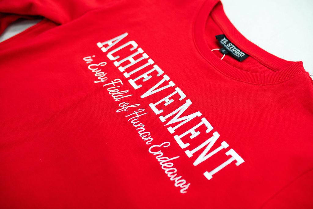 - Red crewneck sweatshirt with embroidered design across chest