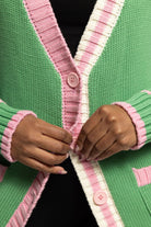 - Heavyweight cardigan with pink accents. Right arm stripe detail
